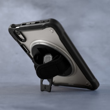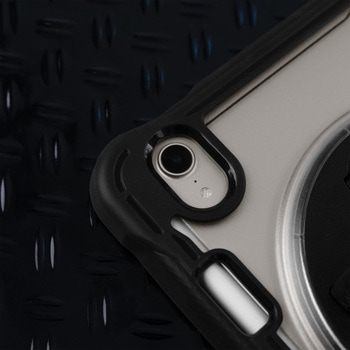 落としても安心な耐衝撃素材を使用/360度回転ホール/動画視聴・タイピングに適した縦横スタンド/ワイヤレス充電対応のApple Pencilホルダー内臓/Apple Pencilホルダーつき(裏面)/長さ調節が可能な面テープハンドル/縦横対応のストラップホールつき/長さ調節可能なバックルつきショルダーストラップ付属