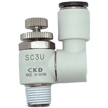 配管方向を360°自由に設定できるユニバーサルタイプのスピードコントローラです。樹脂部には難燃性PBT(UL94規格V-0相当)を標準採用しています。配管ねじ部にフッ素系樹脂のシール剤をコーティングしています。微速シリンダなど流量が少なく、微調整が必要な機器の制御に最適です。