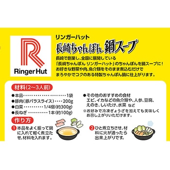 リンガーハットのちゃんぽんを鍋スープに!【臭みのないまろやかなスープ】長時間じっくりと豚骨を丁寧に炊き出し、臭みのないまろやかなスープに仕上げております。【美味しさのポイントは炒め感】豚肉、野菜を炒めペースト状にし、スープに練り込んでおります。ちゃんぽんの美味しさのポイントの一つである炒め感を付与しております。様々な具材のうま味!ちゃんぽんは肉、魚介類、野菜の様々な具材をたっぷり使った料理です。豚肉の旨味、エビ、アサリの旨味、野菜の風味の具材由来のポークエキス、魚介エキス、野菜エキス、香味油を配合しその特長をスープに加えております。
