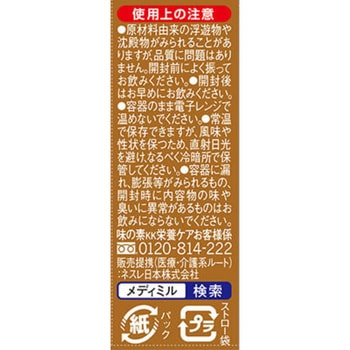 エネルギーやたんぱく質不足しがちなビタミンミネラル等の必要な栄養を少量の100mlサイズに凝縮した飲料タイプの栄養補助食品です。100mlなので負担が少なく飲みきることができます。アミノ酸ロイシンや高齢者に不足しがちなビタミンDを配合しカラダづくりをサポートします。豊富な栄養を一度に摂取できるので食事量が減りやすい高齢者や食事を摂りにくい要介護状態の方の栄養ケアにお役立ていただけます。
