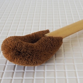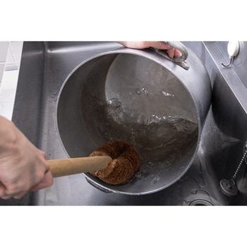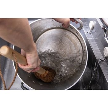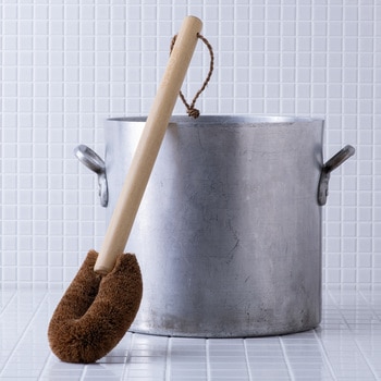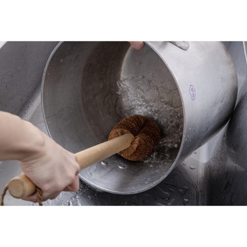 厳選されたパーム(ココナッツ繊維)を惜しみなく使い、寸胴鍋のような深底で広い面積の鍋が洗いやすい柄付きたわし。木製の長柄は握りやすく、力を入れやすい形状に仕上げました。手が届きにくい鍋底にこびりついた、焦げや汚れを落とすことに適しています。たわし本体の大きさは幅が10cm、厚みが5cm、長さが16cmで最大サイズ。たわしがアーチ状に曲がっているのが特徴です。まっすぐな形状のたわしより鍋の底や側面に沿ってゴシゴシ擦ることができます。