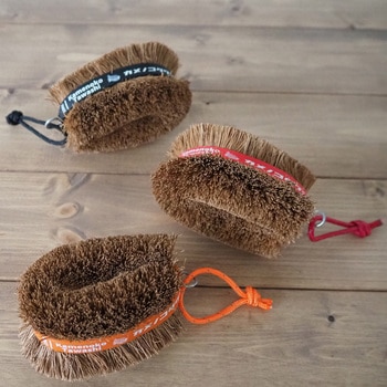 たわしに巻いている帯の上にシリコンバンドを装着する事で、握った時に手が滑りづらくなります。また、シリコンバンドにより通常のたわしよりも繊維が洗浄面に密集するため、鉄板の焦げや靴底の泥落しなど、ゴシゴシ洗いにより向いています。