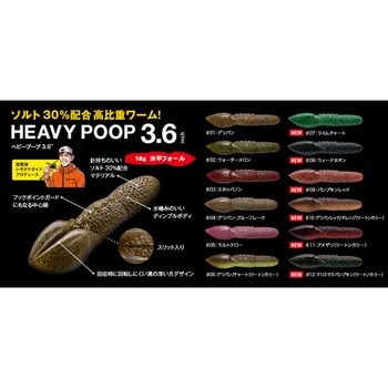 【琵琶湖シモタケガイドプロデュースの高比重ワーム「ヘビプープ3.6”」が登場】マテリアルには針持ちの良さと、比重を両立させたソルト30%配合のマテリアルを使用しながら、18gオーバーのウエイトを確保。フォール時にしっかりと水平フォールすることや、ソフトジャークでもしっかりとダートしアピールできるデザインに仕上げました。爪部分の深い溝は水を流し、回収時に回転しずらくなっており、糸ヨレのストレスを軽減してくれます。