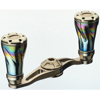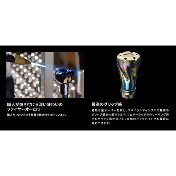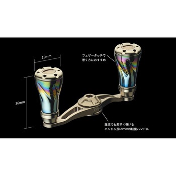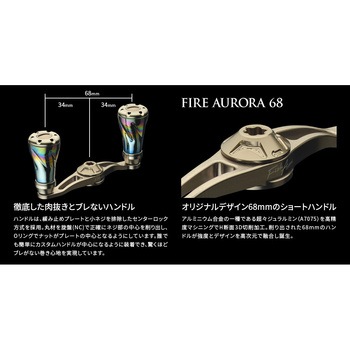【渓流用68mmショートハンドル。激流でも素早く巻けるハンドル長(68mm)のショートハンドルをフィッシュアローオリジナルデザインで新設計】リブレ特有のセンターナットを使うことで、巻きブレを排除、中空チタン製のノブを使用し、プレートは超々ジュラルミンを3D切削することで、高精度・高強度・軽量化を実現。ショートハンドルであえて巻きトルクを抑えることで小型ルアーから伝わる情報をアングラーに届けてくれます。ノブのカラーは最新のベイトフィネスリールから、ABUのオールドリールまでマッチする、ファイヤーオーロラカラーで仕上がっています。