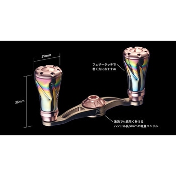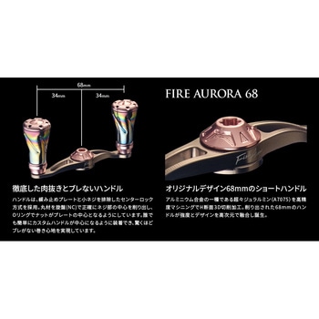 【フェザータッチで巻く方におすすめのフォルテノブ(丸型ノブ)。激流でも素早く巻けるハンドル長(68mm)のショートハンドル、ファイヤーオーロラ68fにピンクモデルが登場!】リブレ特有のセンターナットを使うことで、巻きブレを排除、中空チタン製のノブを使用し、プレートは超々ジュラルミンを3D切削することで、高精度・高強度・軽量化を実現。ショートハンドルであえて巻きトルクを抑えることで小型ルアーから伝わる情報をアングラーに届けてくれます。ノブのカラーは最新のベイトフィネスリールから、ABUのオールドリールまでマッチする、ファイヤーオーロラカラーで仕上がっています。また、ピンクモデルはセンターナット、アルミカラーノブ、エンドキャップがピンクの派手過ぎない渓流に映える可愛いピンクになります。