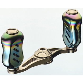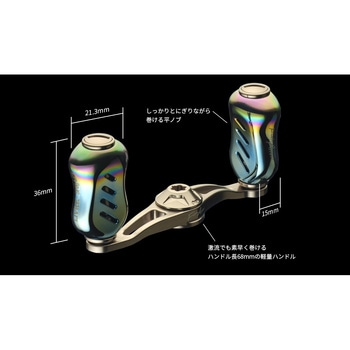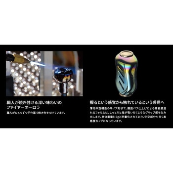 【渓流用68mmショートハンドル。激流でも素早く巻けるハンドル長(68mm)のショートハンドルをフィッシュアローオリジナルデザインで新設計】リブレ特有のセンターナットを使うことで、巻きブレを排除、中空チタン製のノブを使用し、プレートは超々ジュラルミンを3D切削することで、高精度・高強度・軽量化を実現。ショートハンドルであえて巻きトルクを抑えることで小型ルアーから伝わる情報をアングラーに届けてくれます。ノブのカラーは最新のベイトフィネスリールから、ABUのオールドリールまでマッチする、ファイヤーオーロラカラーで仕上がっています。