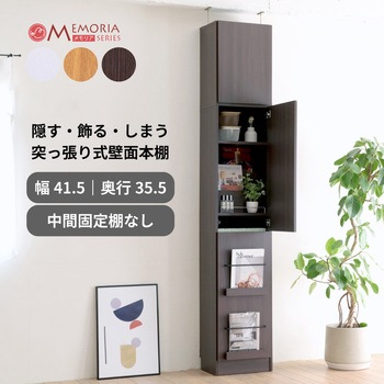 「隠す」「飾る」「大容量」「突っ張り」の全てをを搭載した突っ張り式本棚。A4対応の深型設計に加え、ディスプレイもできる扉が付属。扉で中身を隠しつつ、外側に雑誌を飾れます。本体には飾り棚1枚と可動棚3枚、上置きに可動棚2枚を装備。1cmピッチで調節でき、2列収納も可能。