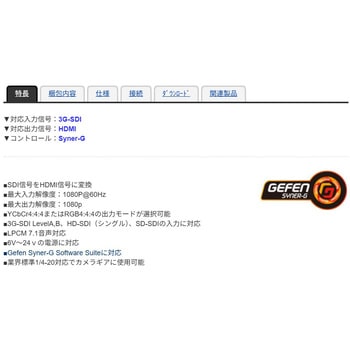 対応入力信号:3G-SDI対応出力信号:HDMIコントロール:Syner-GSDI信号をHDMI信号に変換最大入力解像度:1080P@60Hz最大出力解像度:1080pYCbCr4:4:4またはRGB4:4:4の出力モードが選択可能3G-SDI LevelA,B、HD-SDI(シングル)、SD-SDIの入力に対応LPCM 7.1音声対応6V~24vの電源に対応Gefen Syner-G Software Suiteに対応業界標準1/4-20対応でカメラギアに使用可能