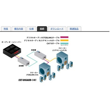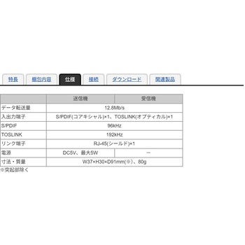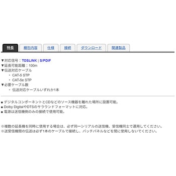 対応信号:TOSLINK | S/PDIF延長可能距離:100m伝送対応ケーブル・ CAT-5 STP・ CAT-5e STP必要ケーブル数・ 伝送対応ケーブルいずれか1本デジタルコンポーネントとCDなどのソース機器を離れた場所に設置可能。Dolby DigitalやDTSのサラウンドフォーマットに対応。電源は送信機側のみの接続で使用可能。
