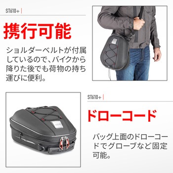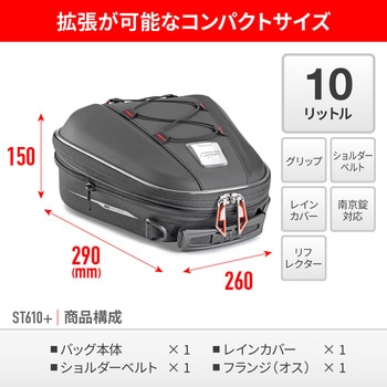 磁石を使わない、車体に簡単に脱着できるタンクロック。ツーリング先で荷物が増えても容量を6Lから10Lへ拡張でき、必要に応じて荷物をしっかり収納できます。磁石を使わないフランジ固定により、バッグがタンクに当たらず車体の傷つきを防止。専用のアタッチメントにより、確実な固定と簡単な取り外しができます。付属品:レインカバー、フランジ オス、ショルダーベルト