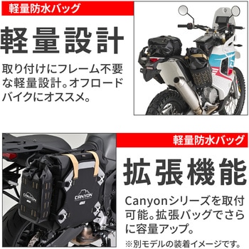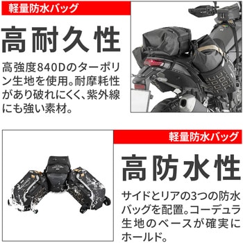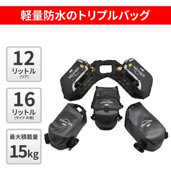 2つの16Lサイドバッグと1つの12Lリアバッグで構成されるトリプル軽量防水バッグ。付属のスチールクランプストラップを使い、フレーム不要でバイク後部にしっかり固定可能です。バッグ本体はコーデュラ、ハイパロン、高強度840Dターポリンなど耐摩耗・耐衝撃性に優れた素材で作られ、長期使用に耐える設計。