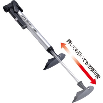 オートバイ・マウンテンバイク専用ミニポンプ。押しても引いてもエア充填が可能なダブルアクションを採用。軽量コンパクトに優れたアルミボディ。力を入れやすく、滑り止め効果のエンボス加工を施したT型グリップ。空気圧を見ながらエア充填が可能なゲージ付き。米式・仏式に対応したリバーシブルアダプター。MTBに装着可能なサイクルホルダー付属。