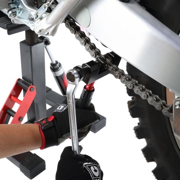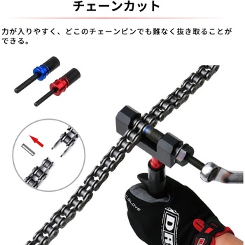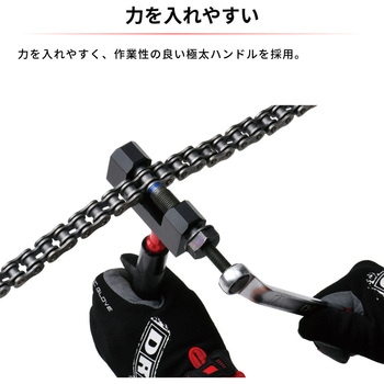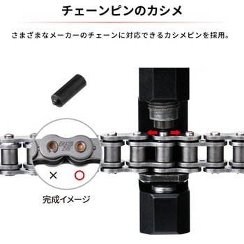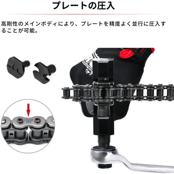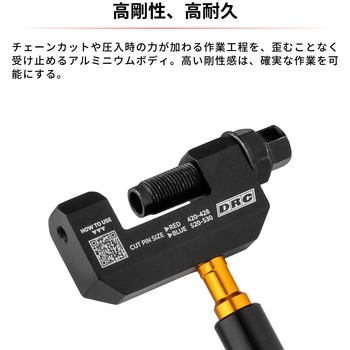 チェーンのカット、プレートの圧入、かしめの3つの作業が可能。DID、RK、EKなど、さまざまなチェーンメーカーの420 / 428 / 520 / 525 / 530サイズに対応。作業の流れを考慮したシンプルな部品構成で、汎用性、作業性、収納性を高めた、サンデーメカニックのためのハイパフォーマンスツール。