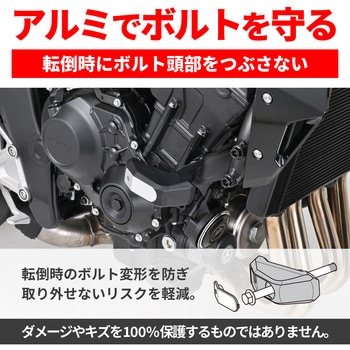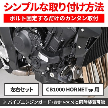 樹脂製パッドが転倒時のダメージを吸収し、マシンへのダメージを緩和。流線形パッドとアルミプレートの組み合わせで機能とドレスアップ効果を両立します。転倒時の衝撃を受け流し、クランクケース割れなどの致命的なマシンダメージを最小限に軽減。車種専用設計により、車両に合わせた適正な張り出しを設定。取り付けが簡単なボルトオン設計。アルミプレートが転倒時のボルト変形を防ぎ、ボルト頭部つぶれによる取り外せないリスクを軽減。メーカーエンジンガード(品番:62415)との同時装着可能。