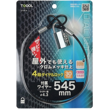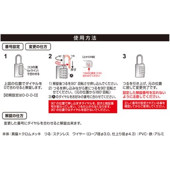 ワイヤー付きのダイヤル式南京錠宅配ボックスや門扉などにダイヤル錠本体はクロムメッキ仕上げでサビに強く、弦は強度の高いステンレス製(240時間塩水噴霧試験後でも問題なく鍵が開閉できます。※大阪市立工業研究所調べ)解錠番号は好みの番号に変更できます