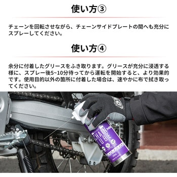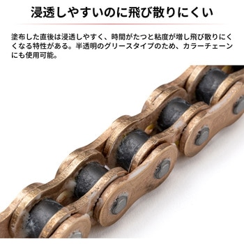 優れた潤滑性能を持つフッ素樹脂配合の化学合成チェーンルブ。浸透しやすく、飛び散りにくい半透明のグリースタイプ。ゴムを傷めないのでシールチェーンにも使用可能。防錆性、耐水性に優れ、チェーンを長持ちさせる。持続性が高く、土や泥が付着しても潤滑を維持し、林道ツーリングに最も適したチェーンルブ。