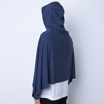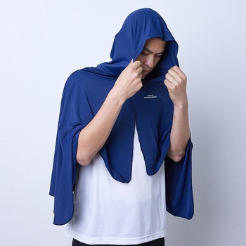 のびのびストレッチ生地なので、女性や小柄な方から大柄な体型までカバーします。最高クラスの接触冷感Q-MAX 値0.5 とAg+ の銀イオンの消臭効果があります。UV カット率99%で紫外線からお肌を守ります。フード付きで頭からひんやりクールダウン、水に濡らして絞るだけです。