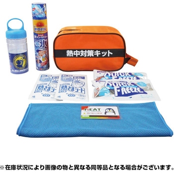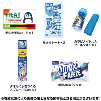 ポーチ×1、タオルに氷をつくるスプレー230ml×1、カラビナボトル入クールタオル×1、熱中症予防カード×1、熱さまシート×2、瞬間冷却パック×2