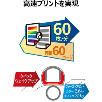 カラー・モノクロ問わず、片面・両面同速60ページ/分のハイパフォーマンス。ファーストプリントタイム5.6秒(カラー)、3.9秒(モノクロ)のクイックウェイクアップで、枚数の多い印刷業務にもスピーディに対応。