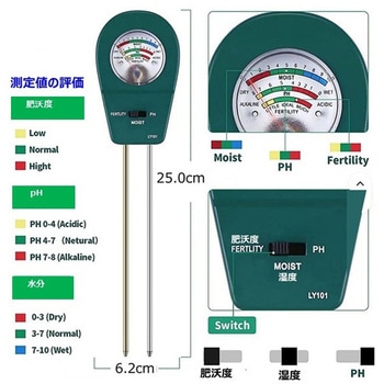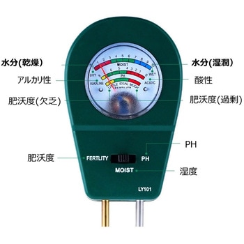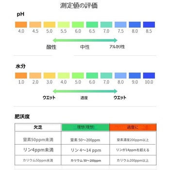 (1)土壌のpH値、肥沃度、水分を検査して、肥料が必要かどうかを把握できます。(2) 測定範囲 土壌pH値:1 ~ 8、土壌肥沃度:不足~適切~過剰量、土壌水分:1 ~ 10 (3) 異種金属電極によるガルバニック電池で誘起される電位差で動作するので電池不要です。(4) 小型、軽量で、屋内、屋外どこにでも持ち運んで使用できます。
