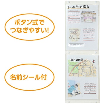 ボタン式でつなぎやすい!名前シール付!縦に連結できる掲示ホルダーです。ボタン式でワンタッチ連結ができ、A4資料を上下にすっきり並べて省スペースに掲示できます。教室やオフィス、イベント会場の案内掲示に最適で、名前シール付きだから担当やクラス名の表示も簡単です。