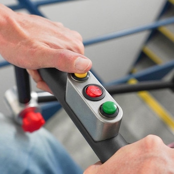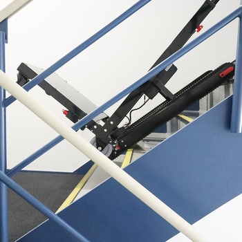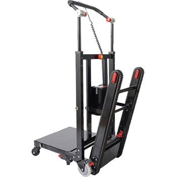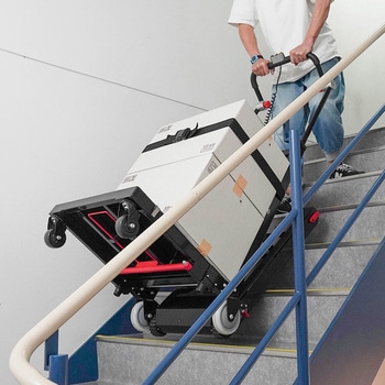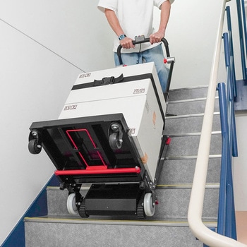 ハンドル部が曲がることで階段移動がさらに楽になる、台車ごと階段昇降が可能な荷台が折りたためる電動階段昇降機です。