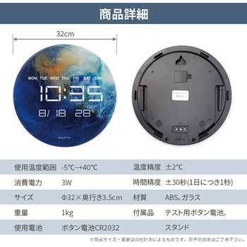 付属品テスト用ボタン電池、スタンド、電源コード、アダプター材質ABS、ガラス質量(kg)1使用温度範囲(℃)0~40消費電力(W)3寸法(直径Φ×高さH)(mm)320×350温度精度±2℃使用電池ボタン電池CR2032(本体記録用)時間精度±30(1日につき1秒)内容量1個