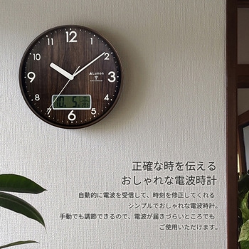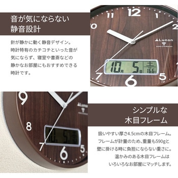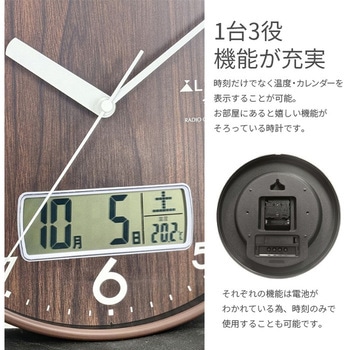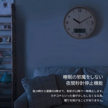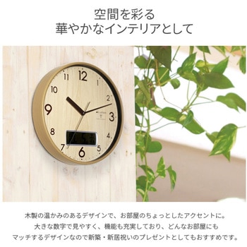 シンプルで見やすいアナログ時刻表示に加え、デジタルでカレンダーと温度も表示します。時計特有のカチコチする音が気になりにくい、針が静かになめらかに動く静音設計です。ぬくもりのある木目カラーがどんなお部屋にも馴染みやすいデザインです。