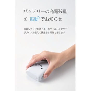 モバイルバッテリーの電池残量を、振動でお知らせ。側面のボタンを押すと、モバイルバッテリーがブルブル震えて残量を5段階で示します。かばんやポケットの中に入った状態でも、触れるだけで電池残量を確認できて便利です。