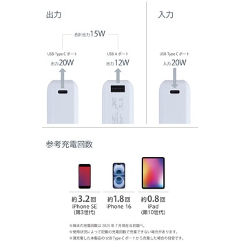 その他Lightningポート搭載の端末で使用する場合は別途Lightningプラグのケーブルをご用意ください。付属品USB Type-C - USB Type-Cケーブル(0.1m)、絶縁シール色しろちゃん(ホワイト×ブラック)質量(g)約193使用温度範囲(℃)0~45コネクタ形状【電源入力側】USB Type-C(TM)ポート、【電源出力側】USB Type-Cポート×1、USB-Aポート×1定格入力電圧(V)2005/9/12対応機種iPhoneおよびUSB端子で充電するスマートフォン、タブレット、他小型電子機器対応【電気用品安全法】○PSE 特定以外の電気用品外形寸法(幅W×奥行D×高さH)(mm)60×29×82バッテリー3.65V/10000mAh 36.5Wh定格出力電圧USB Type-C充電時間約2時間30分 ※製品本体のみを充電した場合の目安です。スマートフォンなどのモバイル機器を接続した場合は記載の時間では充電できません。定格入力電流(A)3/2.22/1.67電池充電式リチウムイオン電池保証期間1年間定格出力電流USB Type-C使用可能回数1000回内容量1個