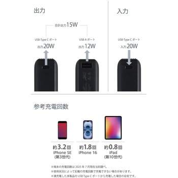 その他Lightningポート搭載の端末で使用する場合は別途Lightningプラグのケーブルをご用意ください。付属品USB Type-C - USB Type-Cケーブル(0.1m)、絶縁シール色ブラック質量(g)約193使用温度範囲(℃)0~45コネクタ形状【電源入力側】USB Type-C(TM)ポート、【電源出力側】USB Type-Cポート×1、USB-Aポート×1定格入力電圧(V)2005/9/12対応機種iPhoneおよびUSB端子で充電するスマートフォン、タブレット、他小型電子機器対応【電気用品安全法】○PSE 特定以外の電気用品外形寸法(幅W×奥行D×高さH)(mm)60×29×82バッテリー3.65V/10000mAh 36.5Wh定格出力電圧USB Type-C充電時間約2時間30分 ※製品本体のみを充電した場合の目安です。スマートフォンなどのモバイル機器を接続した場合は記載の時間では充電できません。定格入力電流(A)3/2.22/1.67電池充電式リチウムイオン電池保証期間1年間定格出力電流USB Type-C使用可能回数1000回内容量1個