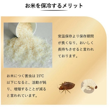 お米の保存に最適な15℃で庫内をキープするからお米の美味しさそのままに保管できるライスクーラーです。使い方はとても簡単。電源ONで自動で冷却を開始、外気を遮断し内部の空気を循環し鮮度をキープします。ワンプッシュで1合取り出しだから計量も簡単です。保冷状態、保管日数、庫内量など庫内状態は一目でわかる液晶表示付き。保冷中の音は47dbと図書館と同じくらいの静音で音を気にせずご使用いただけます。