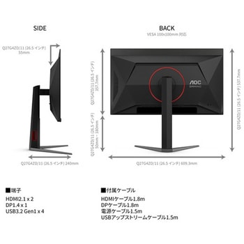 仕様●サイズ:対象外製品の為●パネル方式:26.5型●表示色:QD-OLED●解像度:約10億7300万色●輝度:2560×1440ドット●コントラスト比:450cd/m2●視野角:80000000:1●入力端子:左右178°、上下178°●ケーブル:HDMI2.1 x 2、DisplauPort1.4 x 1●アダプタ:電源ケーブル1.5m、HDMIケーブル1.8m、Displayportケーブル1.8m、USBアップストリームケーブル1.5m●USB:なし●スピーカー:なし●適合規格:なし●プラグ アンド プレイ:RoHS2、VCCI、J-moss。PC3R、PSE●本体サイズ(H×W×D):VESA DDC2B/CI 規格対応●本体重量:537.7 x 609.3 x 240.0mm●電源:5.60kg●本体カラー:AC100~240V●環境自己主張マーク:ブラック●VCCI:なし●PCリサイクル:対応●RoHS指令:対応●J-Moss:対応RoHS10●標準消費電力:対応●スリープ時消費電力:78W●モニタ形状:0.5W●表面処理:平面●リフレッシュレート:ハーフグレア●応答速度(G to G):280Hz●上下角度調整(チルト)機能:0.03ms●左右角度調整(スイベル)機能:あり 上:23度 下:-5度●高さ調整:あり 60度●縦回転(ピボット)機能:あり 130mm●バックライト:あり 90度●Display HDR:QD-OLED●電気用品安全法(本体):DisplayHDR True Black 400●電気用品安全法(付属品等):適合●電気用品安全法(備考):適合/例外承認表面処理ハーフグレアコントラスト比1500000:1、【スーパーハイ(DCR)】80000000:1解像度2560×1440色(本体)ブラック入出力端子HDMI 2.1、DisplayPort 1.4、USB 3.2 Gen1モニターサイズ26.5型パネル駆動方式QD-OLE内容量1台