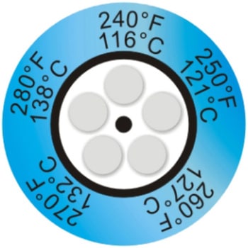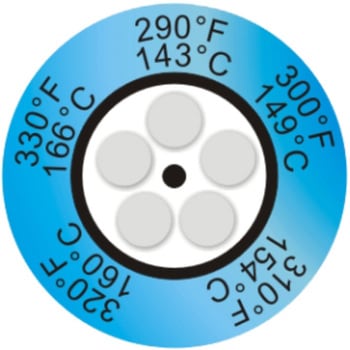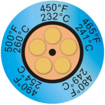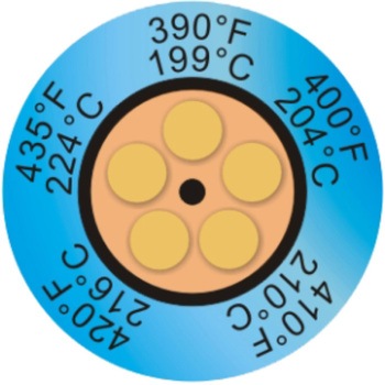 最高の品質を誇る温度ラベルです。精度/100℃まで±1℃、100℃以上±1%反応時間1秒以内29~290℃の範囲で48段階の変色温度表示温度に達すると変色し、非可逆性で温度の永久記録ができます。表面温度の正確な測定に理想的で回転体の温度の測定もできます。接着剤が裏面に塗布しており、測定個所にワンタッチで貼るため、使用が簡単です。原子核関連装置に使用認可されています。