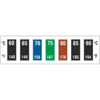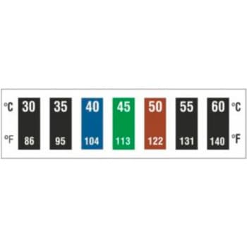 可逆性の測温ラベルで他の温度計と同様に繰り返し温度を表示します。裏面に接着加工がされておりますので、どこにでも簡単に張り付けて使うことが出来ます。精度は±1℃、反応速度は1秒以内です。液晶の温度は茶→緑→紺と変わります。茶は表示温度よりやや低く、緑が表示温度、紺は表示温度よりわずかに高い状態を示します。