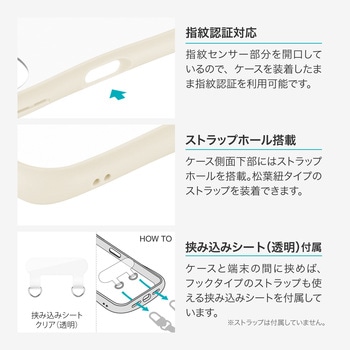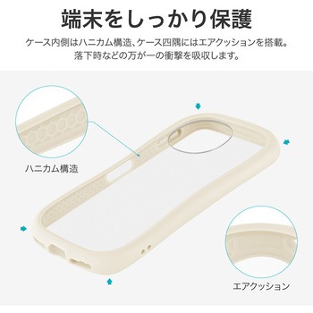 【60日間保証】【耐衝撃】 衝撃を吸収・分散するハニカム構造のTPUと、割れにくく軽量なPCのハイブリッドケース/側面全体がなめらかにラウンドした持ちやすいデザイン/ボタンや端子周りを保護する精密設計/ストラップホール搭載(側面)/写真やステッカーを使ったアレンジも楽しめる背面クリア仕様/ショルダーストラップの取り付けに最適な「挟み込みシート」付属