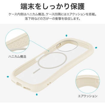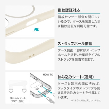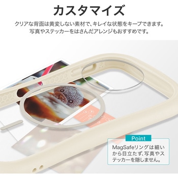 【60日間保証】【耐衝撃】 MagSafeアクセサリが使えるマグネットリング搭載/背面に挟んだステッカーの邪魔になりにくい細いリング設計/衝撃を吸収するTPUと、硬く高透明なポリカーボネートのハイブリッドケース/側面全体がなめらかにラウンドした持ちやすいデザイン/レンズ周りを高く設計/ボタンまで保護/ストラップホール搭載(側面)/ショルダーストラップの取り付けに最適な「挟み込みシート」付属