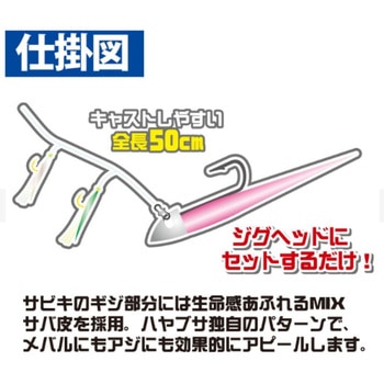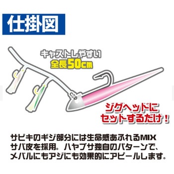 メバリング・アジングなどのライトゲームのシークレットリグライトゲーム時のジグヘッドやウルトラライトジグに装着できるサビキリグ。サビキの擬餌部分には生命感あふれるMIXサバ皮を採用。ハヤブサ独自のパターンで、メバルにもアジにも効果的にアピールします。