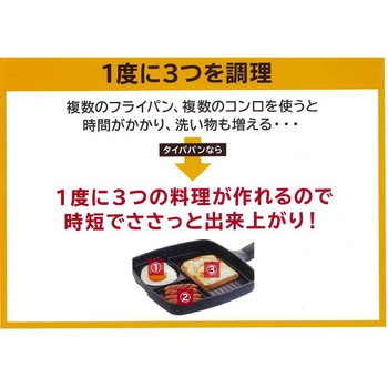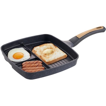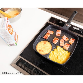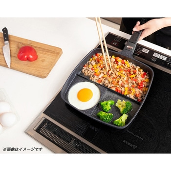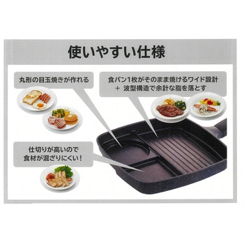 1度に3つの料理が作れる仕切りフライパン。仕切りが高いので食材が混ざらず料理そのままの味が楽しめます。メイン料理部はワイド設計で、食パンが1枚そのまま焼けます。丸型部分を使えば、目玉焼きが丸くきれいに簡単に作れます。朝食から夕食、お弁当まで、様々な料理が作れます。メイン仕切り部分は、波形構造なのでお肉などの食材の余分な油を落とし、ヘルシーに調理できます。 ガラス蓋付きなので、料理の状態が一目でわかるだけでなく、油はね防止にもなります。ガラス蓋のつまみ部分(凹部分)には、菜箸やターナーなどのキッチンツールが置けるので便利です。