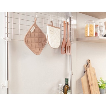 フライパン・鍋と合わせて使いたくなるカローテ監修の鍋敷き。タグ・ネームは綿素材なので耐久性に強い。フックに掛けられて収納困らない。