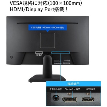 さらに、2.5W+2.5Wのステレオスピーカーを内蔵し、音声出力にも対応。VESAマウント(100mm)に対応しているため、モニターアームへの取り付けも可能です。