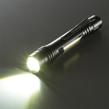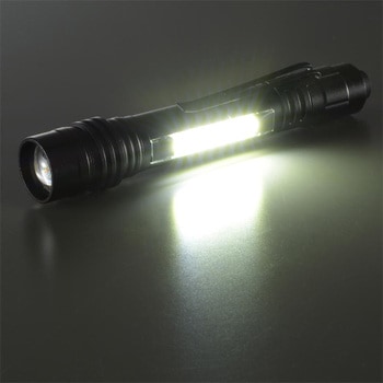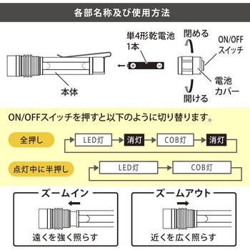 長さ(mm)113質量(g)約36(乾電池別)切替方式【ON/OFFスイッチ】全押し:LED灯→消灯→COB灯→消灯、点灯中に半押し:LED灯→COB灯最大径(Φmm)約20連続使用時間(時間)LED:約3.5/COB:約3※未使用・新品アルカリ乾電池使用時※電池の性能や使用状況により異なります光源白色LED/白色COB(交換不可)使用電池単4形乾電池1本(別売)光束(Lm)LED:約60/COB:約65※簡易的に本体を積分球に入れ、新しい電池で実測した数値照射距離(m)約30m(LEDモード集光時)※理論値として満月時の月の明るさ(0.25Lux)で照らすことができる照射距離内容量1個