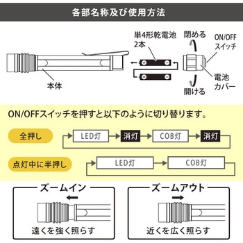 仕様ズームイン/遠くを強く照らす、ズームアウト/近くを広く照らす長さ(mm)145質量(g)約45(乾電池別)切替方式【ON/OFFスイッチ】全押し:LED灯→消灯→COB灯→消灯、点灯中に半押し:LED灯→COB灯最大径(Φmm)約20連続使用時間(時間)LED:約5/COB:約4.5※未使用・新品アルカリ乾電池使用時※電池の性能や使用状況により異なります光源白色LED/白色COB(交換不可)使用電池単4形乾電池2本(別売)光束(Lm)LED:約90/COB:約160※簡易的に本体を積分球に入れ、新しい電池で実測した数値照射距離(m)約35m(LEDモード集光時)※理論値として満月時の月の明るさ(0.25Lux)で照らすことができる照射距離内容量1個