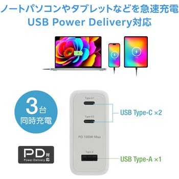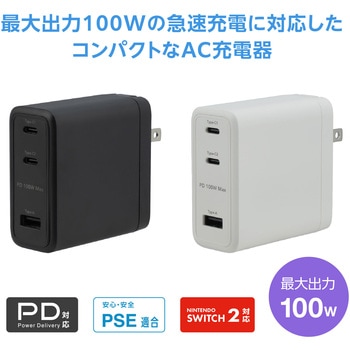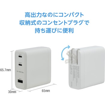 最大100W出力に対応、USB Type-C×2ポートとUSB Type-A×1ポートを搭載し、最大3台の機器を同時に急速充電可能なAC充電器。