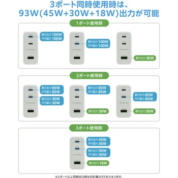 質量(g)約232ポート数3出力1ポート使用時・・C1,C2: 5V/3A, 9V/3A, 12V/3A, 15V/3A, 20V/5A(最大100W), PPS最大100W A1: 5V/3A, 9V/3A, 12V/2.5A(最大30W), PPS最大30W、2ポート同時使用時・・C1+C2:C1:5V/3A, 9V/3A, 12V/3A, 15V/3A, 20V/3.25A (最大65W), PPS最大65W C2:5V/3A, 9V/3A, 12V/2.5A, 15V/2A,20V/1.5A(最大30W) C1orC2+A1:C1orC2:5V/3A, 9V/3A, 12V/3A, 15V/3A, 20V/3.25A(最大65W), PPS最大65WA1:5V/3A, 9V/3A, 12V/2.5A(最大30W) 3ポート同時使用時・・C1+C2+A1:C1:5V/3A, 9V/3A, 12V/3A, 15V/3A, 20V/2.25A (最大45W), PPS最大45W C2:5V/3A, 9V/3A, 12V/2.5A, 15V/2A, 20V/1.5A(最大30W), PPS最大30W A1:5V/3A, 9V/2A, 12V/1.5A(最大18W)入力AC 100 - 240V, 50Hz/60Hz, 2.5A Max外形寸法(幅W×奥行D×高さH)(mm)65×65.7×30 ※プラグ収納時保証期間6ヶ月間出力端子USB Type-C(メス)×2、USB Type-A(メス)×1RoHS指令(10物質対応)対応内容量1個