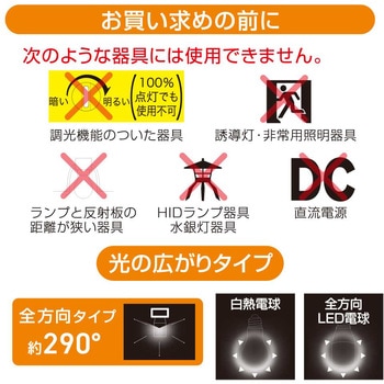 小形電球相当の明るさで、省エネ・長寿命を実現 密閉形器具対応・断熱材施工器具対応 横向き・斜め付け器具にも取り付け可能 全方向タイプ(約290°配光)でムラのない明るさ 省エネ法2027年度目標基準達成 E17口金