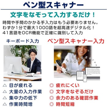 OCR(光学文字認識)機能を搭載したペン型スキャナーで、紙の資料や本の文字をなぞるだけで、最大1分間に1000語をテキストデータ化できます。縦書き・横書き両対応で、右利き・左利きどちらでも使いやすい設計です。