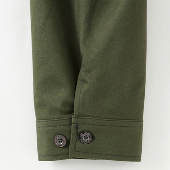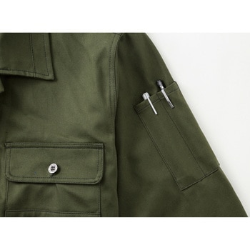 フロント・コイルファスナー、フラップ・袖口/メタルボタン、ウエスト/脇ゴム、左袖ペン差し