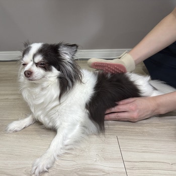 なでるだけでマッサージ+抜毛ケア!手に装着して愛犬・愛猫をなでるだけ。撫でる感覚で使えるので力加減が分かりやすく、デリケートな部分にも使用しやすいのが特徴。ペットの抜け毛や毛玉対策に。肉球をデザインしたイメージ。