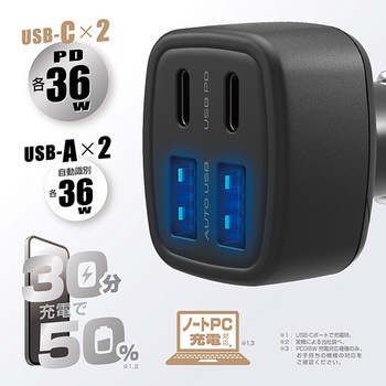 車載用USB電源×4ポートタイプ。車のDCソケット電源からスマホ/タブレット/ノートPCを充電できる。(出力合計最大72W)USB-Cポートは、USB Power Delivery規格の高速充電に対応。USB-Aポートは、端末を最適充電できる自動識別IC搭載。通電時にUSBポートがブルーに発光し演出。(暗い車内でもコネクタを接続しやすい)12V/24V車対応。軽自動車から大型車まで様々な車種に対応。